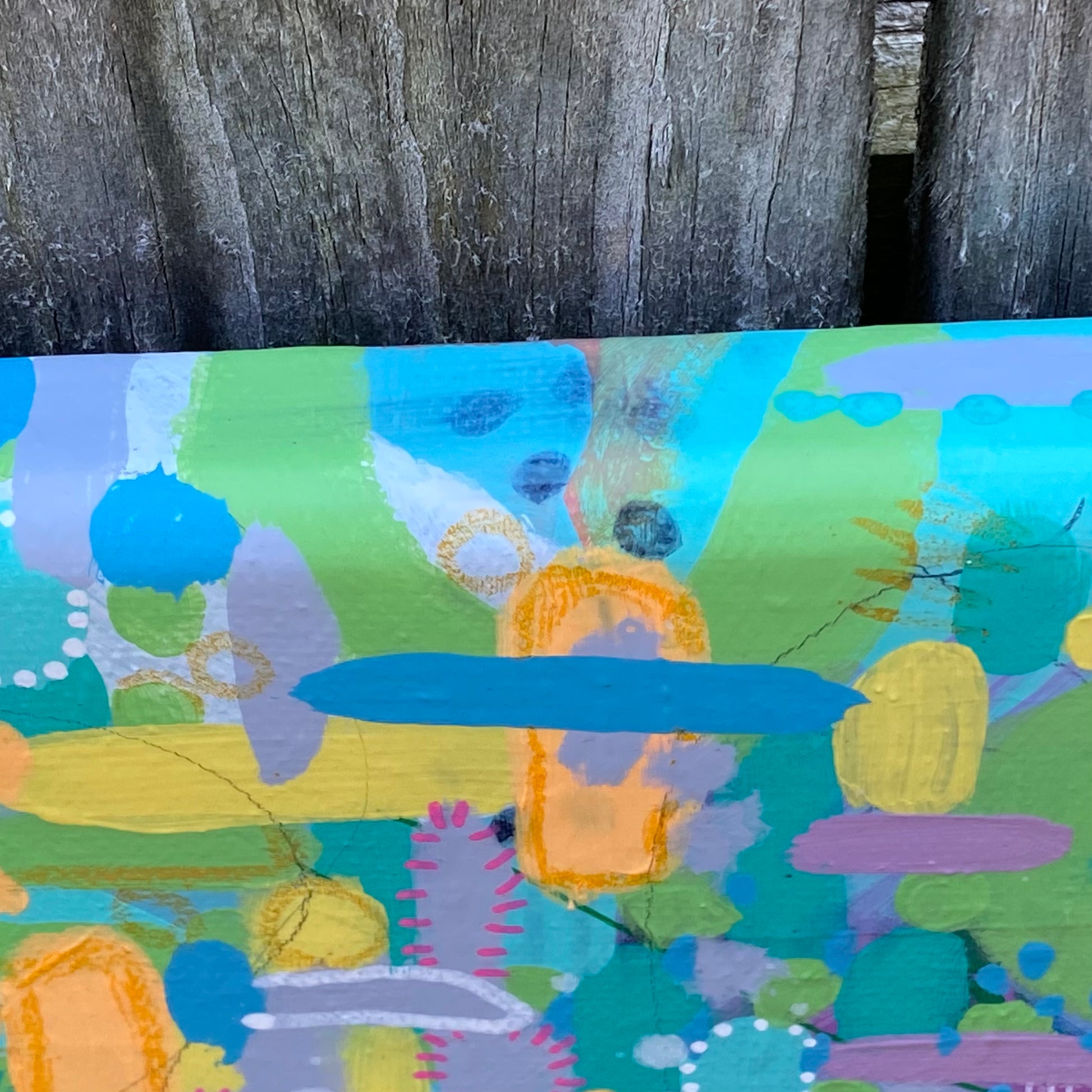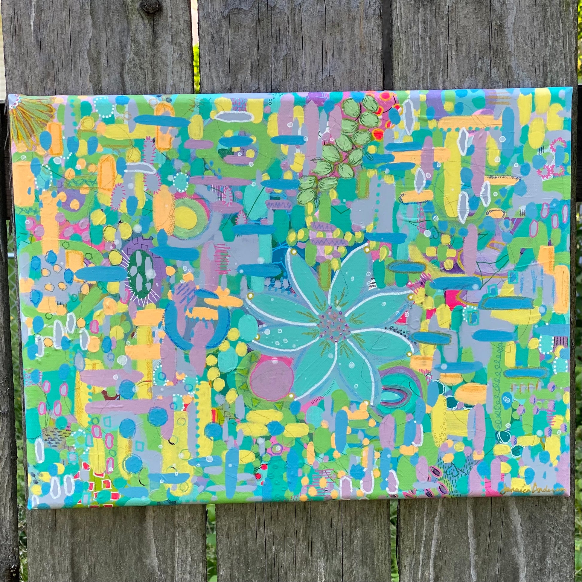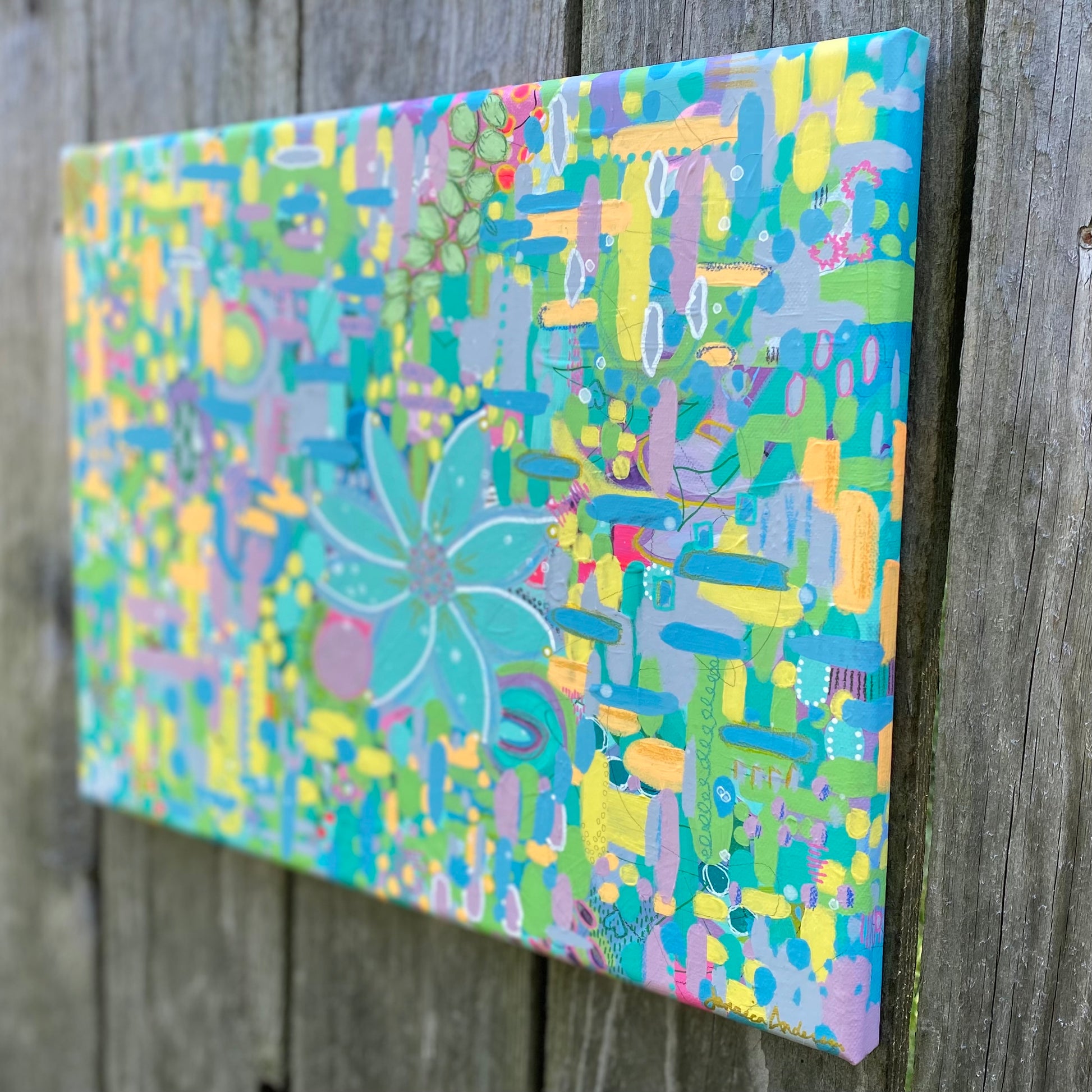 Spring Break was my first real dive into Abstract Expressionism… this freeing type of painting is extremely relaxing and appealing to the eyes. I did notice a small smudge on the top edge during the varnishing process so I have listed this piece with a significant discount (please see the last photo for a closeup of the smudge). The color family is more subdued in this painting with a colorful mix of pastel yellows, blues, greens, pinks, purples & a touch of black and white.